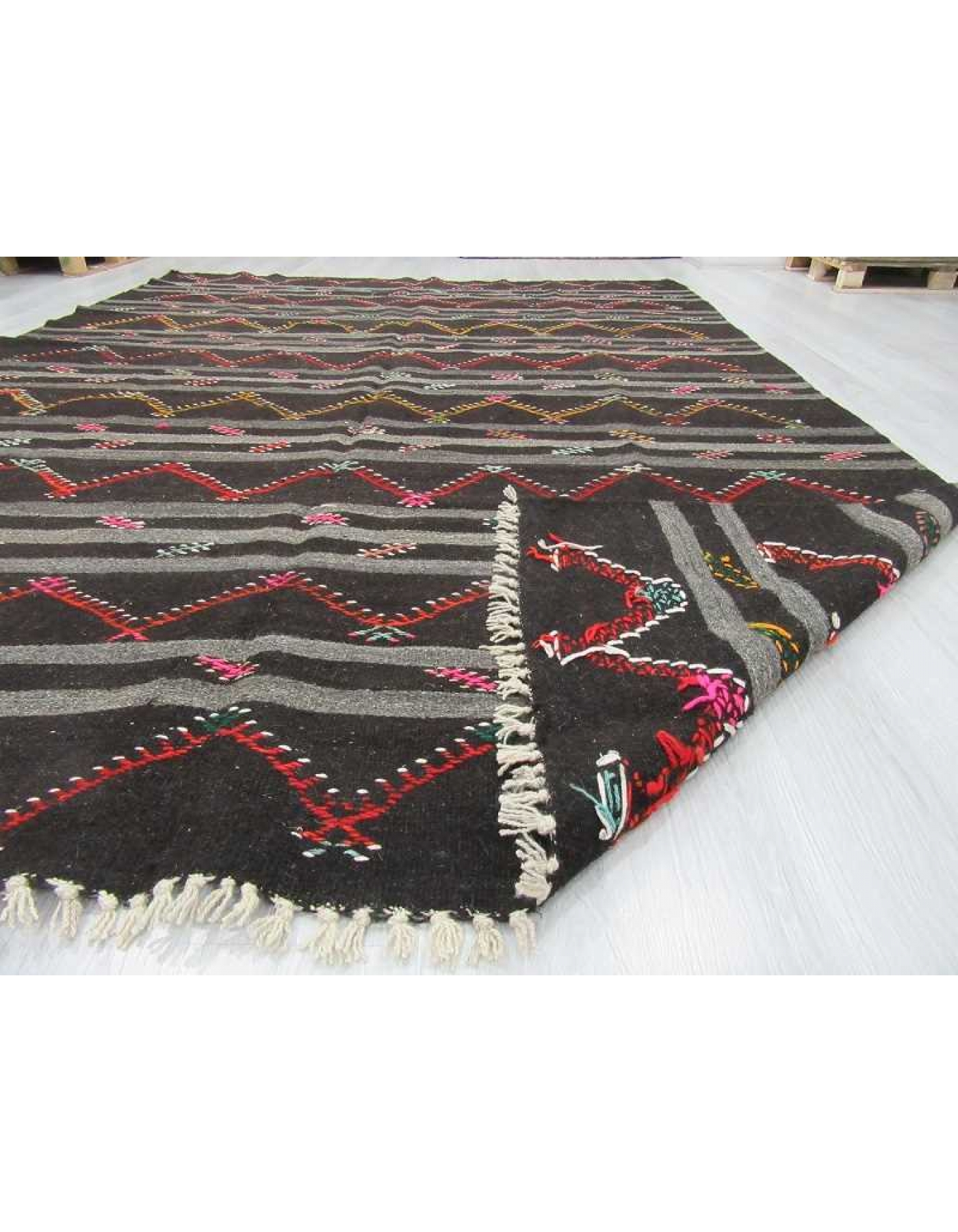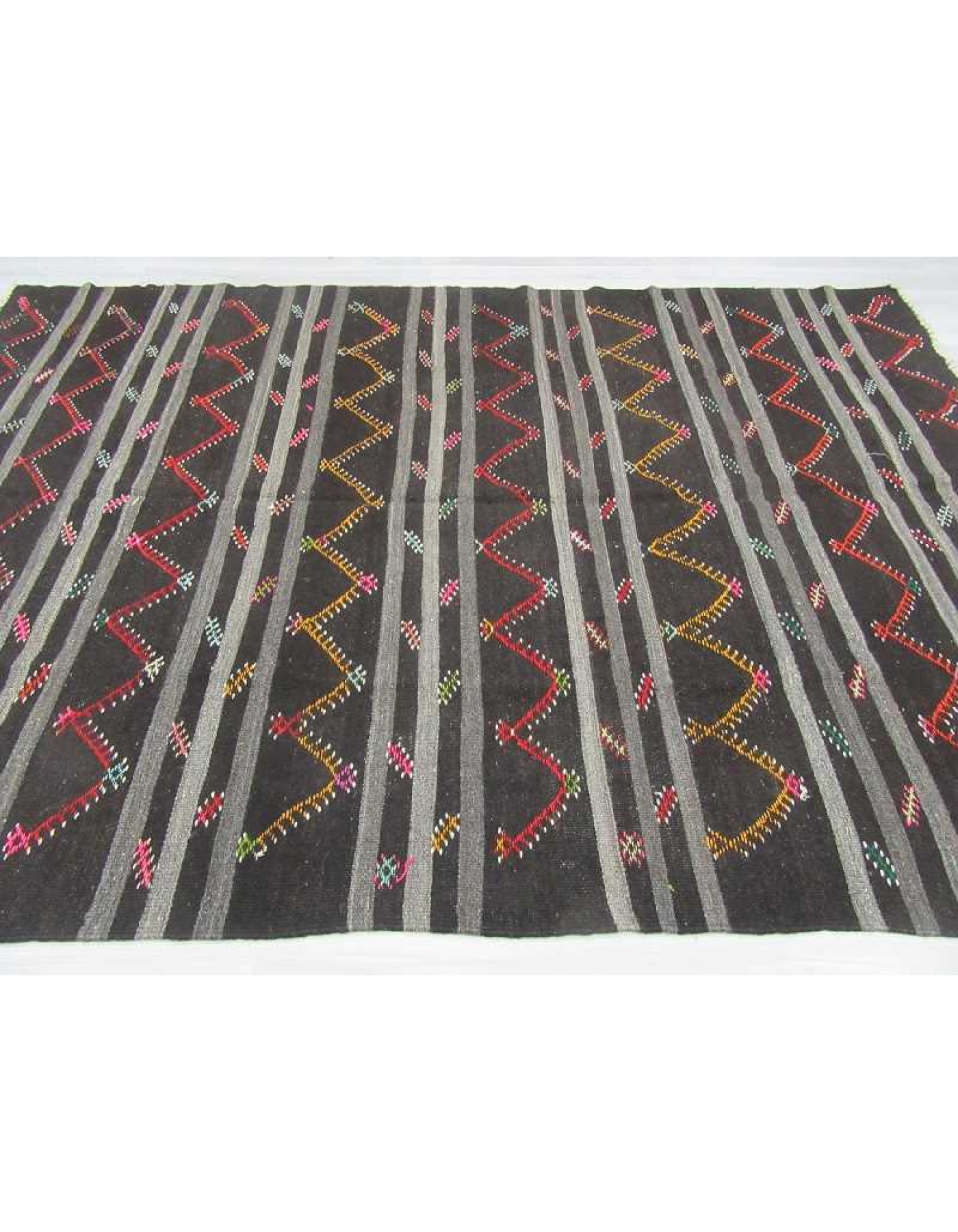 Vintage embroidered black and grey striped large goat hair kilim rug